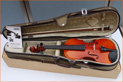 今回お持ち込みいただいたお品物は、ケース・弓が付属したバイオリンセットで、初心者から学生まで幅広く人気のあるSUZUKIブランドのモデルでした。日本国内でも非常に知名度が高く、学校の部活動や音楽教室などでも多く使用されているブランドです。